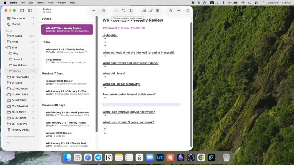 So in January I’ve set up folder in my Notes app on my Mac, and started logging. I’ve decided that I future me would appreciate structure and review not only “Did this – Bought that – Visited XYZ”, but also snippet of how I was feeling, what I was thinking and track internal changes.