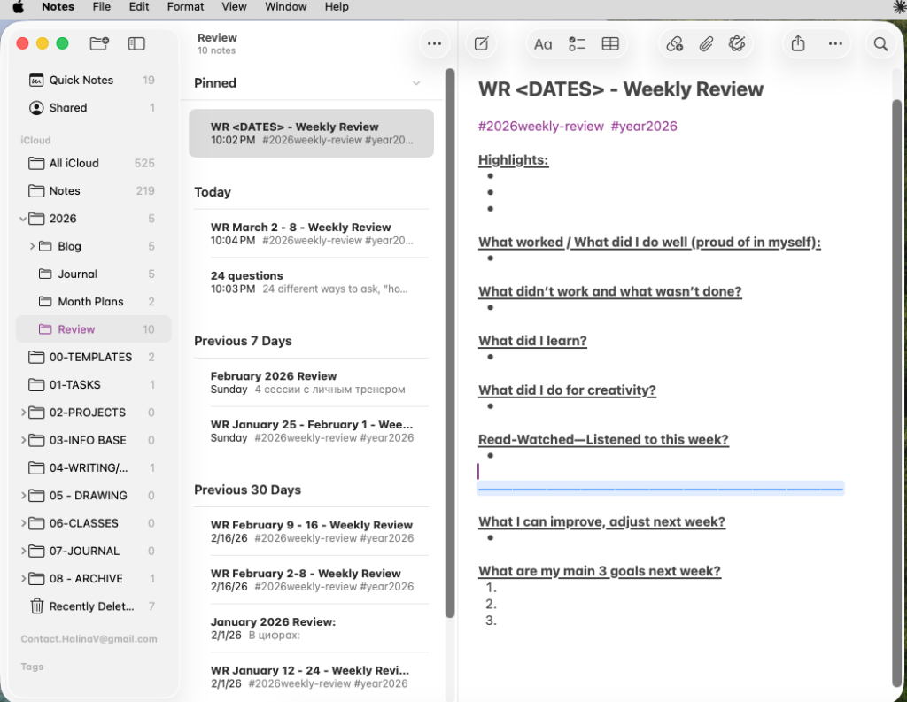 I’ve set up a separate note as a template, pinned it to the top of the folder, and when I am ready to do week review, I duplicate a note and update dates in the title.