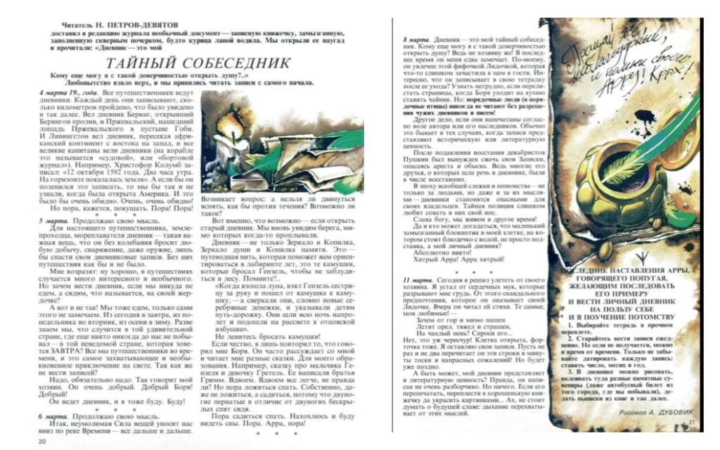 I started keeping a journal (diary) when I was in 4th or 5th grade. I remember seeing pages in the kids magazine “Трамвай” (published in USSR in 1990-1995). Pages that told me (and thank you internet for scanned pages of the magazine):